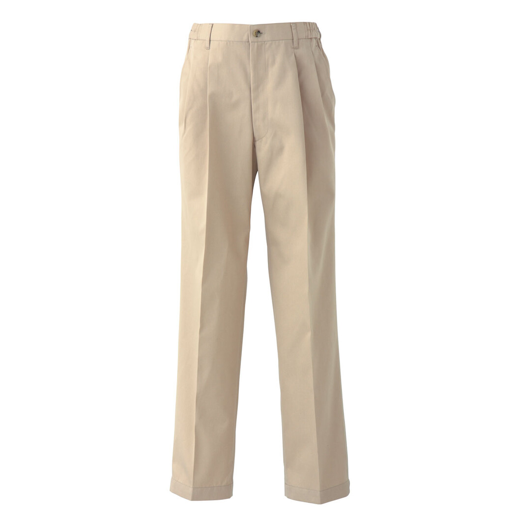 年齢を問わず着用出来るチノパン、男女兼用です。股上深くしゃがんだ際にも安心。シルエットもワイド、ゆったりしています。脇ゴムですのでウエストの許容も大きく着用感はとても楽です。制電糸入り。