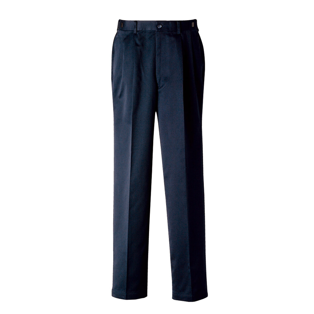 股上深め、ツータック、脇にはアジャスター付きの男性用チノパンツ。年齢問わず安心して着用出来ます。シルエットはワイドめ、ゆったりと着用出来ます。裾は始末されていませんので裾上げ加工が必要です。股下85cmの長さで用意されていますのでそこから自分の丈に修正するかたちちになります。同じチノパンで裾上げ加工されているものもあります。UL7712、こちらは全サイズ股下78cmに加工されています。制電入り。