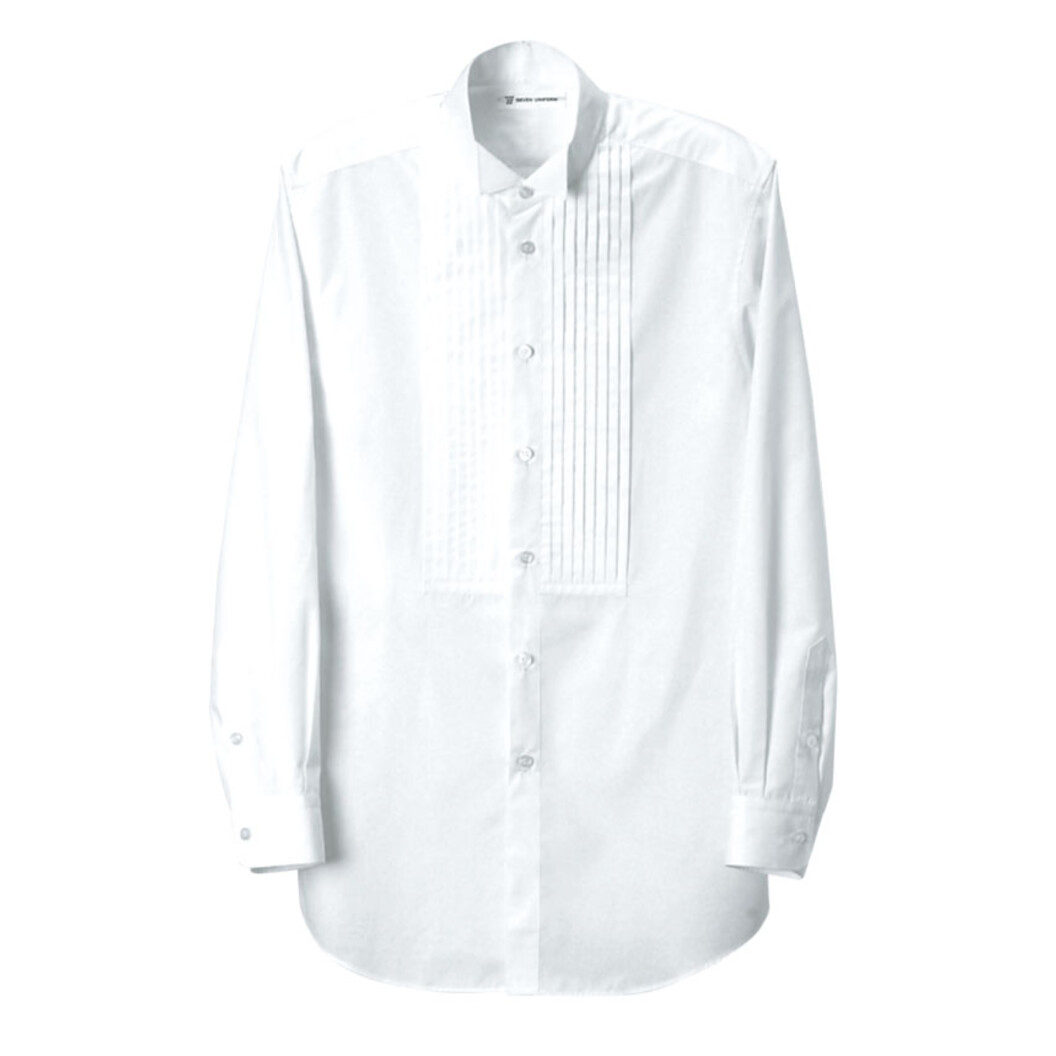 フォーマルシャツ。ウイングカラー、プリーテッド・ボザム(胸部分にプリーツある)ディティールが特徴。毛混のタキシードやジャケット等と合わせてフォーマルよりのサービスシーンにオススメです。襟の後ろ中心にチョウタイをした際に外れないようループがあります。肩ヨークは生地が斜めに裁断されていますので、多少の伸びを感じ着心地の良さを配慮したものになっています。生地はポリエステル混ですが綿の風合いがしっかりある良い素材。男性用。