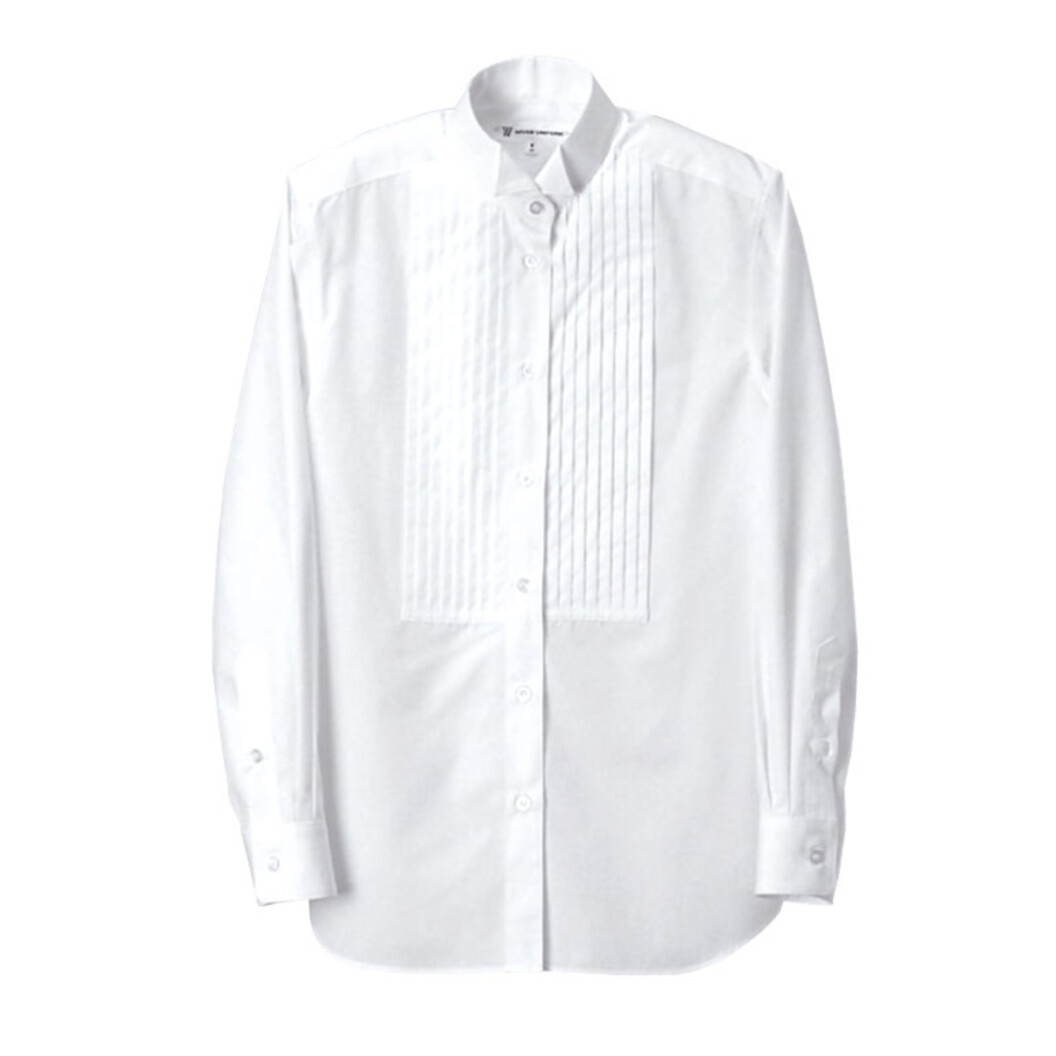 フォーマルシャツ。ウイングカラー、プリーテッド・ボザム(胸部分にプリーツある)ディティールが特徴。毛混のタキシードやジャケット等と合わせてフォーマルよりのサービスシーンにオススメです。襟の後ろ中心にチョウタイをした際に外れないようループがあります。肩ヨークは生地が斜めに裁断されていますので、多少の伸びを感じ着心地の良さを配慮したものになっています。生地はポリエステル混ですが綿の風合いがしっかりある良い素材。女性用。