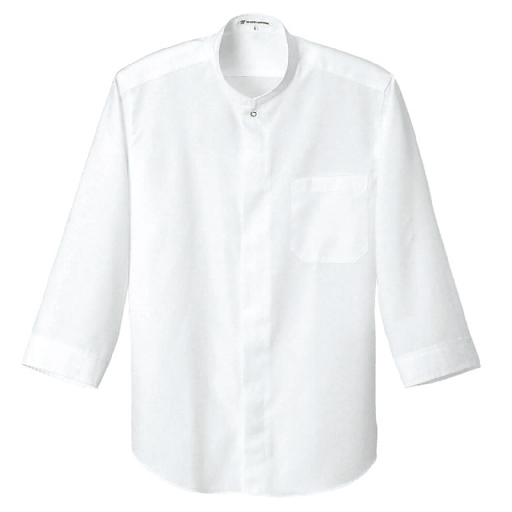 生地に抜群の形態安定性があることろが一番の特徴です。洗濯シワや型崩れがしにくくノープレスでもきれいに着用できる生地になっています。工業洗濯にも対応しています。吸水性もありますので着用感も快適、汚れも落としやすい生地になっております。第一ボタンがリングドットという金属ディティール、スタンドカラー、7~8分袖というデザインポイントから、高い知識を必要とされる接客シーンにお勧めです。前立てあり、左胸にポケットあり。7~8分袖、スタンドカラー。男女兼用。