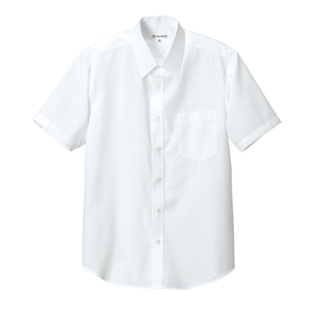 プレーンな白いシャツですが、生地に抜群の形態安定性があることろが一番の特徴です。洗濯シワや型崩れがしにくくノープレスでもきれいに着用できる生地になっています。工業洗濯にも対応しています。吸水性もありますので着用感も快適、汚れも落としやすい生地になっております。スーツで働く人の夏服としての半袖でもよいですし、エプロンと一緒に合わせサービスシーンという場でもオススメです。シンプルがゆえに汎用性の高い白シャツになっています。前立てあり、左胸にポケットあり。半袖、レギュラーカラー。男性用。