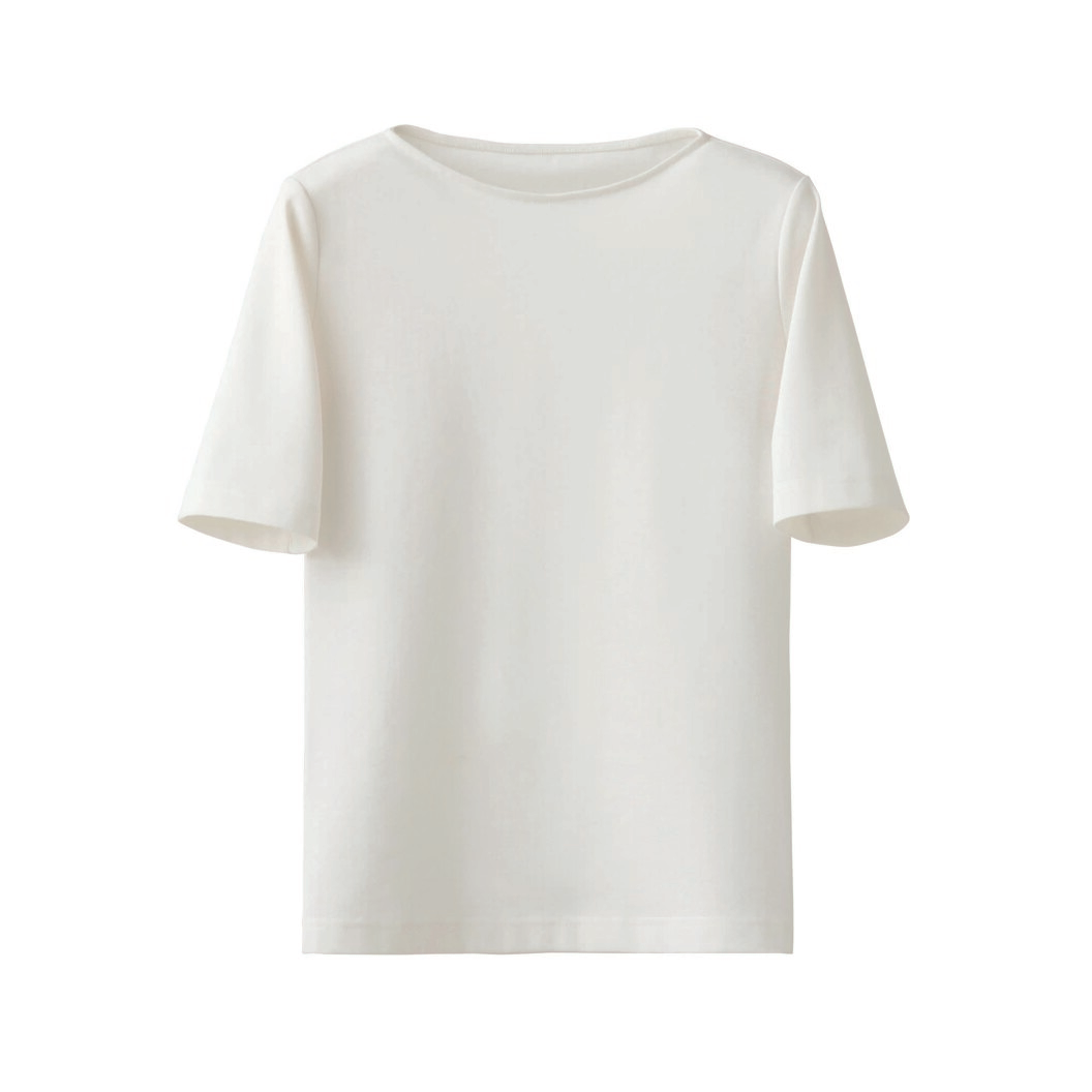ポリエステル100%素材をフライス編みにして作られた5分袖ボートネックTシャツ。フライス編みは生地に厚みを持たせながら伸縮性もあるという特徴があります。厚みがありますので透けに関してはそれほど気にせず着用出来、肌さわりがとても気持ちよいです。一番の特徴はスーパーマルチ加工という数種の機能が付加されているところです。”光+銀触媒” 機能がほっといても、ある程度の匂いや汚れを酸化分解しますので、言い変えますと ”セルフクリーニング” といえるような機能が付いています。その他に吸水速乾、汗ジミ軽減、防臭、抗ピリング(毛玉出来にくい)、弱酸性、防汚性ありと働くユニフォームとしてはとても便利な多機能素材になっています。ボートネックはインナーの肩ひもなどが見えにくいラインになっていたり、袖丈が長めなどホスピタリティーを保つカッティングを施しています。色はベーシックな展開になっており、合わせるコーディネートにより幅広く表現出来るアイテムになっております。