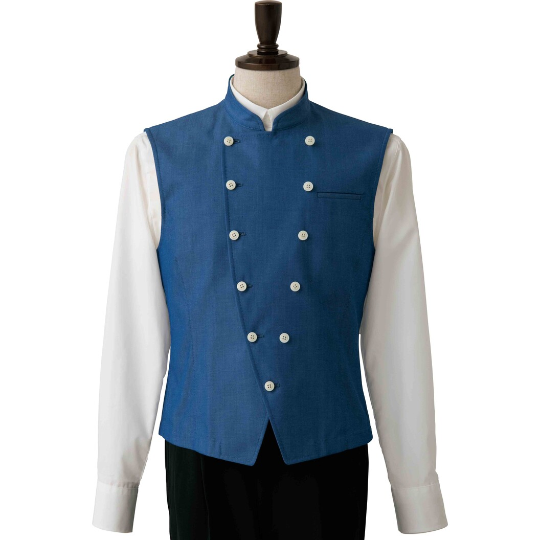サービングベストという新しいアイテムです。シャツやTシャツと合わせて着用することで色々なシーンに対応出来ます。例えばTシャツと合わせればフレンドリーながらも適度なおもてなし感を保ち、絶妙な距離でお客様にサービスをすることが出来ます。またDA2622-1の長袖タイプとは同デザインの袖あり、なしの区別ですので、役職差を分かりやすく付ける、という使い方も出来ます。他にも暑い場所に向けてのスタイリングにも適しています。生地はポリエステル混のデニム生地ですので、色落ちや風合い変化はほとんどありません。デニム特有の経年変化もありません。いつでも鮮やかなインディゴブルーでの接客を保つユニフォーム生地というところも特徴です。