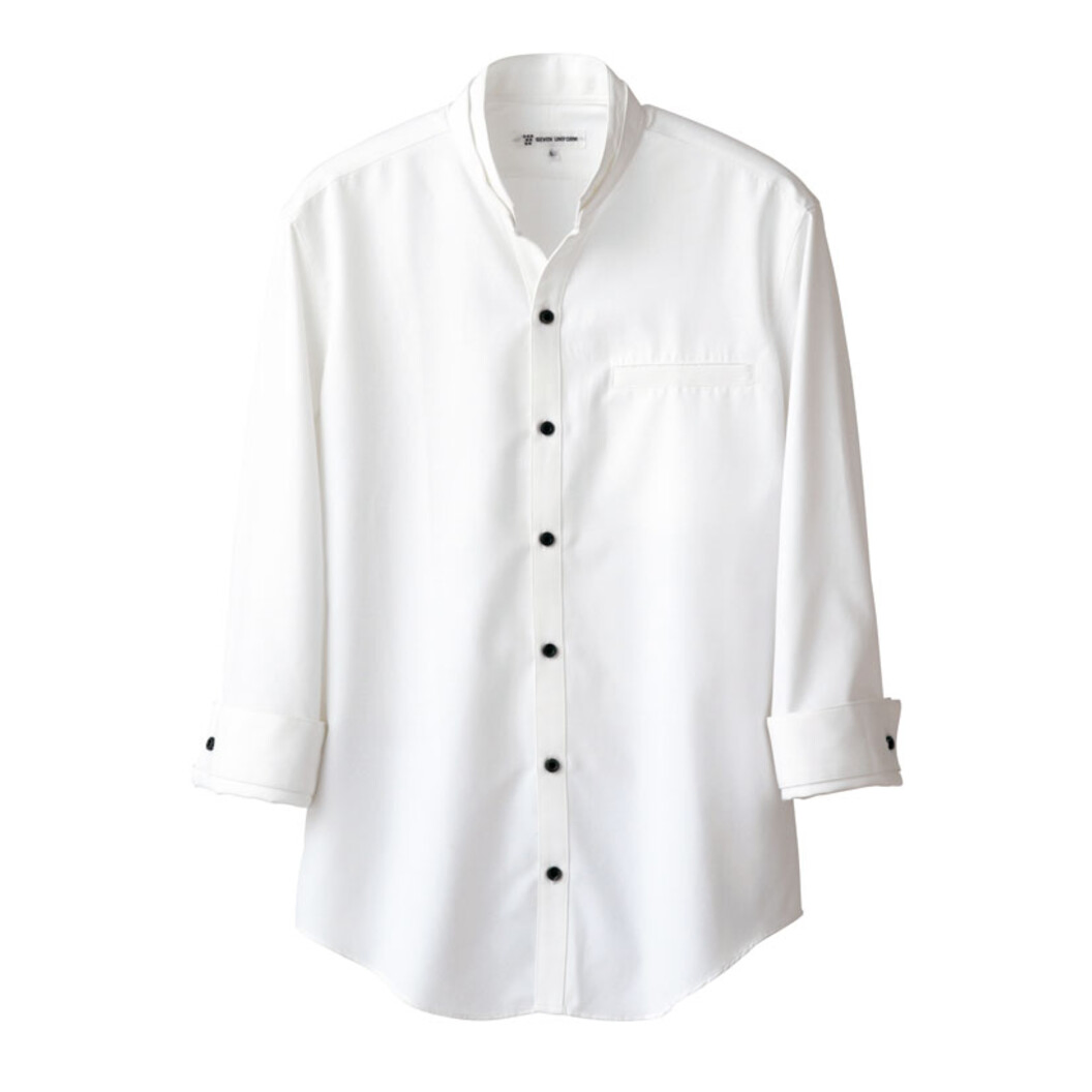 洗濯性に優れ、かつシルクの様な風合いのシャツです。綿とは違う上質な着心地を得ることが出来ます。スキッパー開き、スタンドカラーが2段あるところ、カフスのある袖口が特徴です。襟デザインの印象が強いので、出来ればお店の印象やコンセプトと合う合わないを実際着用し、空間で検証することをオススメします。和洋中とコーディネート次第で色々な表情を作り出せます。他の部分はシンプル、前立てあり、左胸にポケットがあるデザインです。男女兼用、7分袖。透け防止、UVカット機能あり。