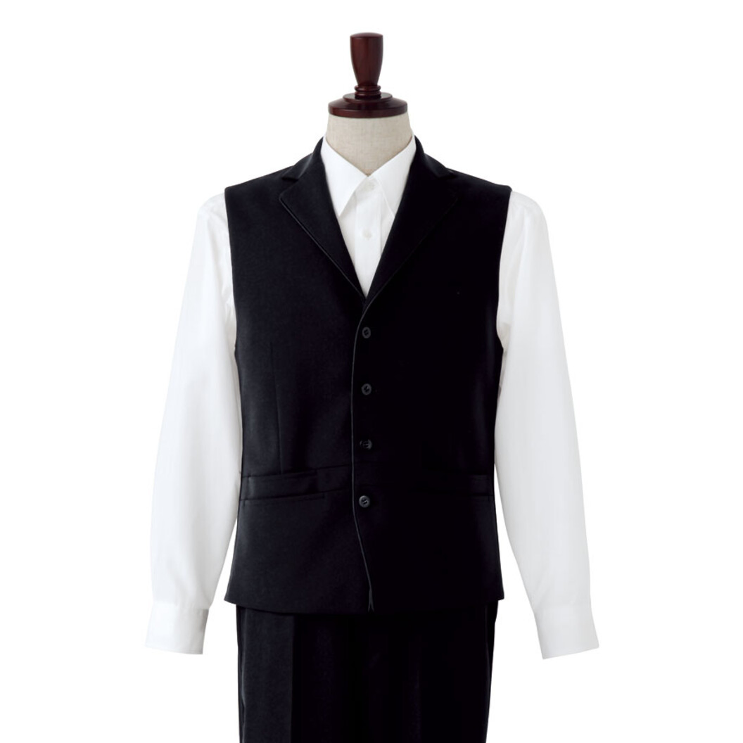 カシミヤ調の柔らかさと、ビロードのような光沢を持つドスキン織りで出来たフォーマル用高級ユニフォーム素材で作られています。しっかりとして厚みも適度にあります。デザインはシングル合わせテーラーカラーベストです。ウエストに2段の切り替えがありソムリエナイフなど色々と小物が入る多機能ポケットを配しています、パリのカフェでよく見るギャルソンが着用されているベストです。テーラーカラーが主張しますのでインナーというより、このアイテムを主役にするというコーディネートがオススメです。総裏仕立て、バックル付きベルトがあり、ウエストをサイズ合わせることが出来ます。制電糸は織り込まれていますので埃を寄せ付けにくい生地になっております。