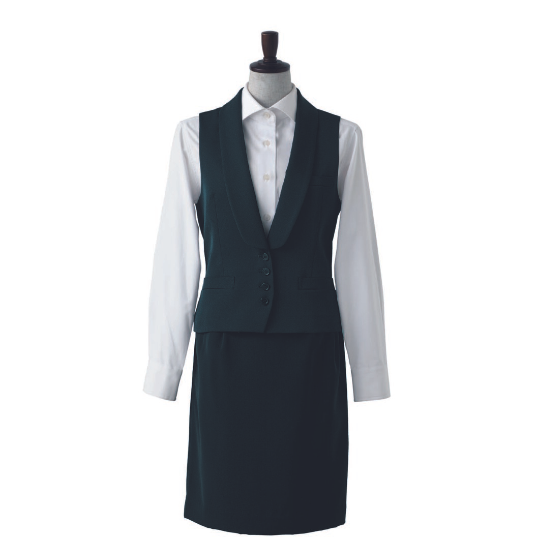 カシミヤ調の柔らかさと、ビロードのような光沢を持つドスキン織りで出来たフォーマル用高級ユニフォーム素材で作られています。しっかりとして厚みも適度にあります。デザインはシングル合わせショールカラーベストです。ショールカラーが主張しますのでインナーというより、このアイテムを主役にするというコーディネートがオススメです。総裏仕立て、バックル付きベルトがあり、ウエストをサイズ合わせることが出来ます。制電糸は織り込まれていますので埃を寄せ付けにくい生地になっております。