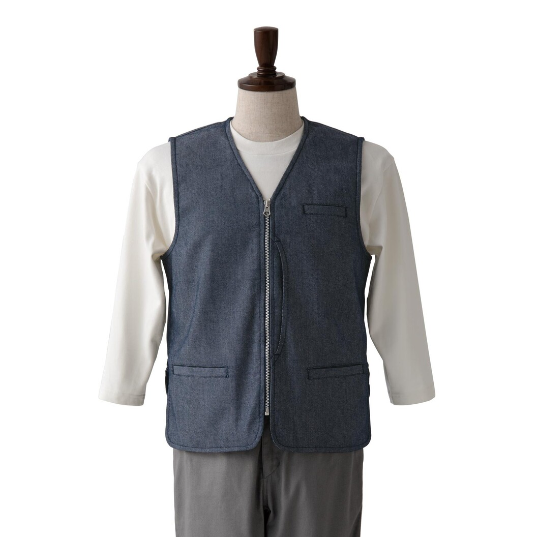 経年劣化しない麻調デニム生地が特徴です。綿デニムのような色落ちがほぼ無いのでいつまでもきれいな色のままを保ちます。麻は入っていませんが麻のようなドライタッチ感、適度なハリコシが着用時に高級感を表現します。ハンティングベストディティールを取り入れたアイテムながらシンプルかつクリーンに作られていますので、カジュアルシーンは当然ながら、少しエレガントよりのシーンまで着用出来ます。後ろに大容量ポケットがあるのも特徴です。ワークアイテムはルーツがあるのでカルチャーを感じさせます。色々な新しいコンセプトが生まれてくる中、色展開もそういったシーンにマッチする3色を用意しています。