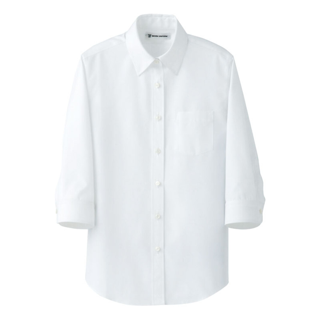 洗濯性に優れ、かつシルクの様な風合いのシャツです。綿とは違う上質な着心地を得ることが出来ます。前立てあり、左胸にポケットがあるシンプルなデザインです。素材感(シルク風)を活かすコーディネートが特にオススメです。例えばエプロンと合わせてエレガントなサービスシーンに活用すると良いと思います。女性用、7分袖。透け防止、UVカット機能あり。