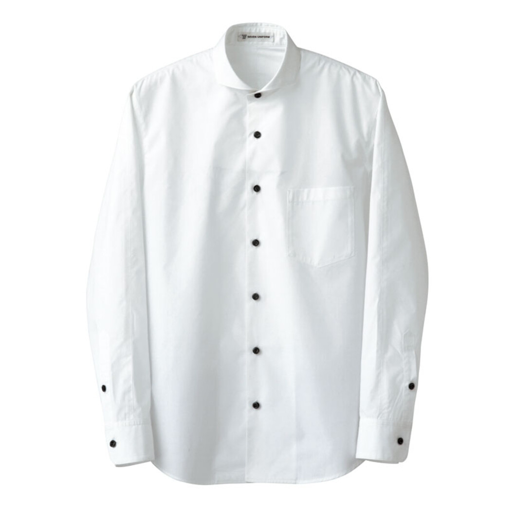 襟が小さいホリゾンタルカラー、小さいがゆえに襟を立てると表情が変わるという特徴があります。背のヨークから袖にかけてつながっているので、腕周りの縫い目がなく動き易いです。白はボタンが黒というのもアクセントになっています。合わせやすいシャツになっています。男性用、長袖。