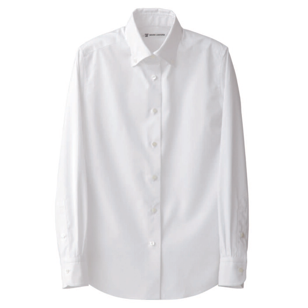 スーツと合わせるボタンダウンシャツとして開発。ネクタイを結ぶと映える襟です。前立てなし、ポケット無しのシャツです。生地は通気の良い素材で、吸水速乾性あり、透けにくく、UVカット機能もある多機能シャツです。女性用。