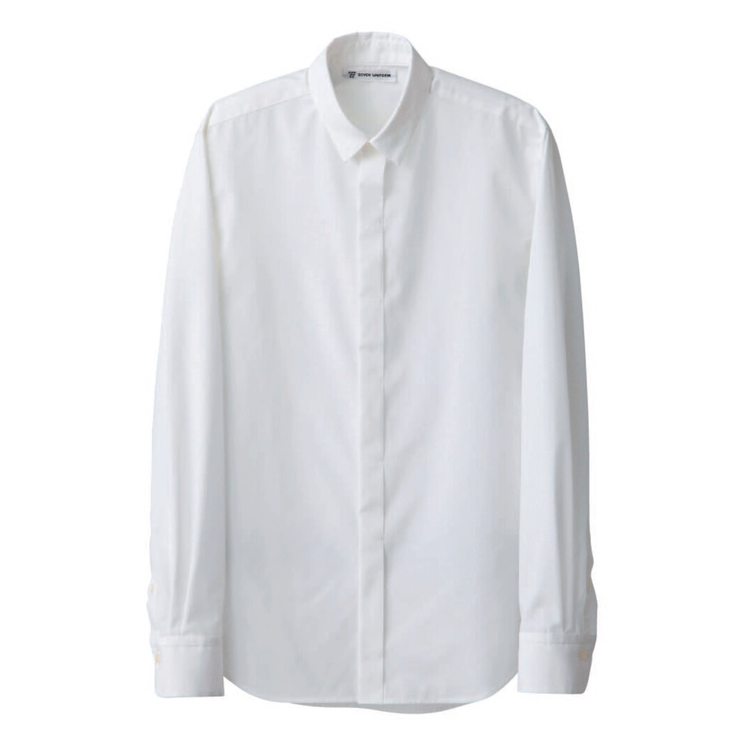 フォーマル、それ以外のエレガントよりのシーンに合わせることが出来るシャツ。小さめの襟、比翼の前立てと見た目がとてもミニマム。コーディネートにより巾広いサービスシーンに合わせることが出来ます。生地はポリエステル高混率ですがとても綿リッチな風合いです。男性用。
