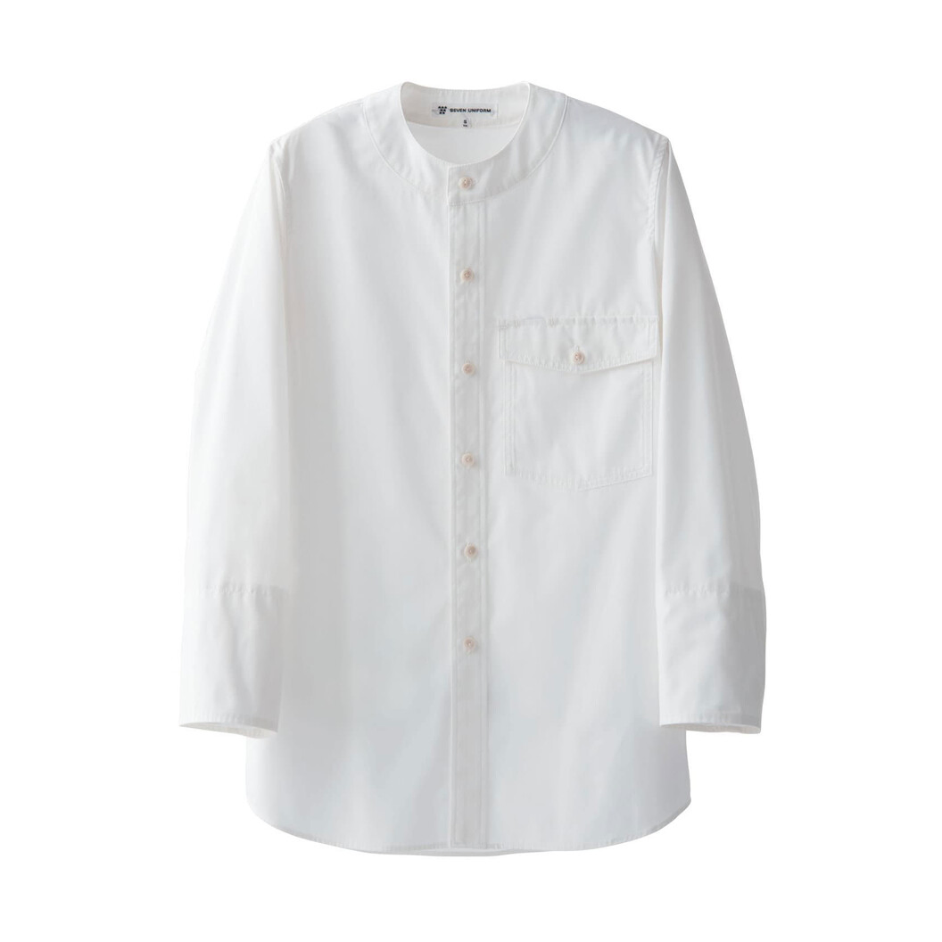 弊社定番のシャツ生地に抗ウイルスの機能を追加したブラッシュアップ素材を使用。強度と安心感を両立しました。袖口にアンダーカバーを配したHACCP対応商品。ノーカラー、ワーキングディティールを取り入れつつすっきりとした印象を与える8部袖シャツ。