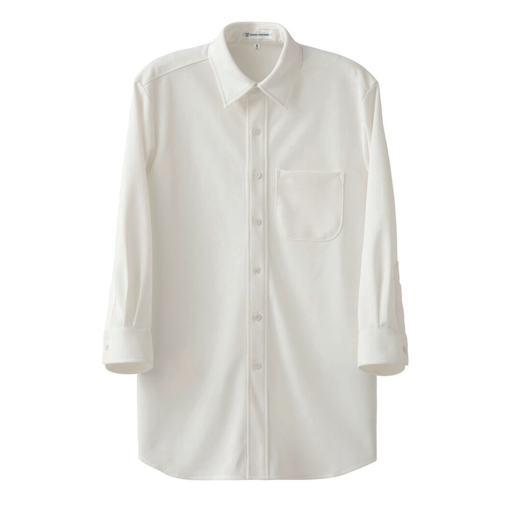 カノコジャージー生地のレギュラーカラー7分袖シャツ。ストレッチをしっかり感じる着心地のとてもよいシャツです。サービスで使用できるよう、カッターシャツに近いカッティングです。また生地が多くの機能を持ち合わせており、吸水速乾、防臭、汚れが落ちやすいSR加工などが付加されていて、特に光と銀触媒機能があることで付着した汚れや匂いのもととなるたんぱく質を自然に酸化分解するので、ある程度ですが洗濯しなくても、勝手にきれいになっていく機能を持ち合わせています。また生地が弱酸性を保ちますので、お肌にも優しい生地になっています。毛玉も出来にくい加工がしてありますので、比較的いつまでもきれいな表面を保ったまま着用出来るアイテムになっています。