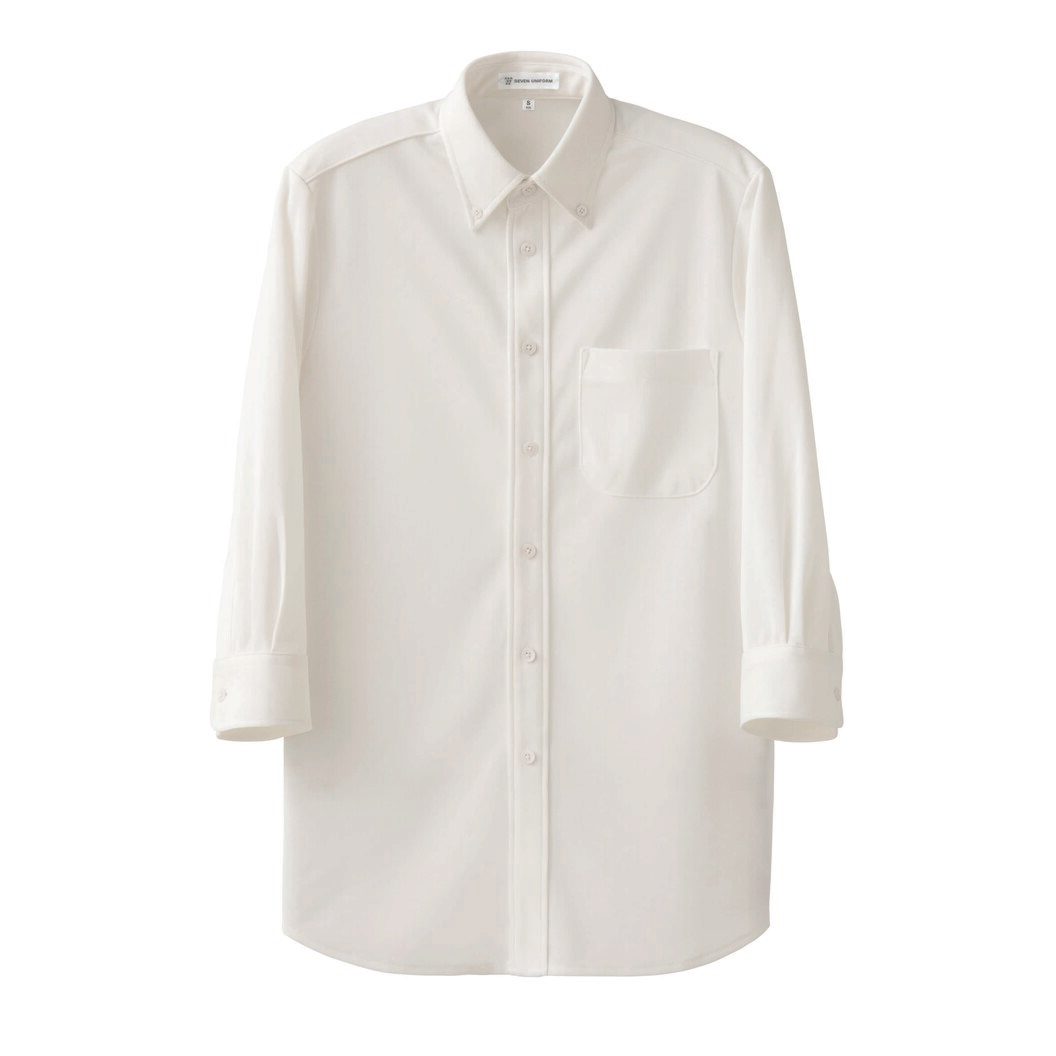 カノコジャージー生地のB.Dカラー7分袖シャツ。ストレッチをしっかり感じる着心地のとてもよいシャツです。レストランサービスでも使用できるよう、カーターシャツに近いカッティングです。また生地が多くの機能を持ち合わせており、吸水速乾、防臭、汚れが落ちやすいSR加工などが付加されていて、特に光と銀触媒機能があることで付着した汚れや匂いのもととなるたんぱく質を自然に酸化分解するので、ある程度ですが洗濯しなくても、勝手にきれいになっていく機能を持ち合わせています。また生地が弱酸性を保ちますので、お肌にも優しい生地になっています。毛玉も出来にくい加工がしてありますので、比較的いつまでもきれいな表面を保ったまま着用出来るアイテムになっています。