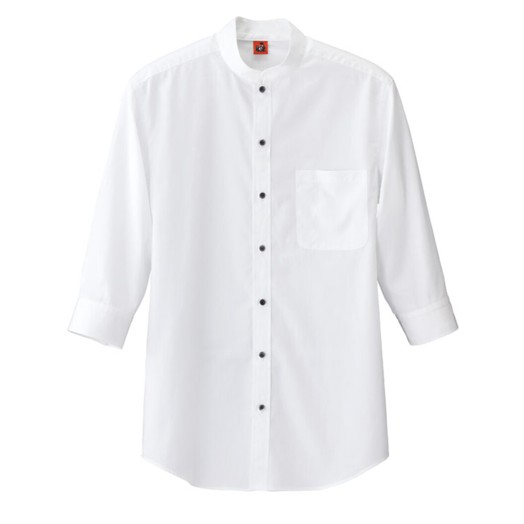 黒蝶貝風のボタンがアクセントになっているスタンドカラー7分袖シャツ。タキシード着用時にスタッドボタン(黒いオニキスのボタン)を付けるのがルールで、そこから着想を得たエレガントなシャツです。7分袖ですのでサービスカジュアルシーンに、このボタンがあることでエレガントなイメージを作ることができます。ポケットにはペン1本分のスペースも用意されています。