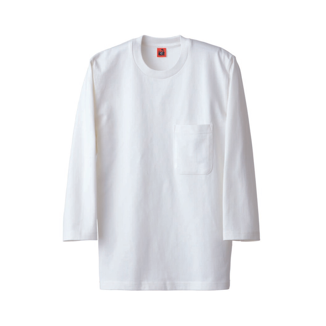 とても厚くしっかりしたジャージー生地で作られたミニマムなユニフォームTシャツです。身体のラインを拾うことのない厚さですので、このTシャツ1枚でホスピタリティーをキープしながらサービスができるものになっています。7分袖なので作業性も高いです。胸のポケットは働く際に、とても重宝します。着丈も一般にあるTシャツより長めなので、動くなかで背中が見えることなく失礼にならないという配慮もあります。首まわりは品格を保つために詰まったデザインになっており、フライスは伸縮性がありますので、すぐに首くりが伸びることもありません。見頃は少しですが伸縮性があります。