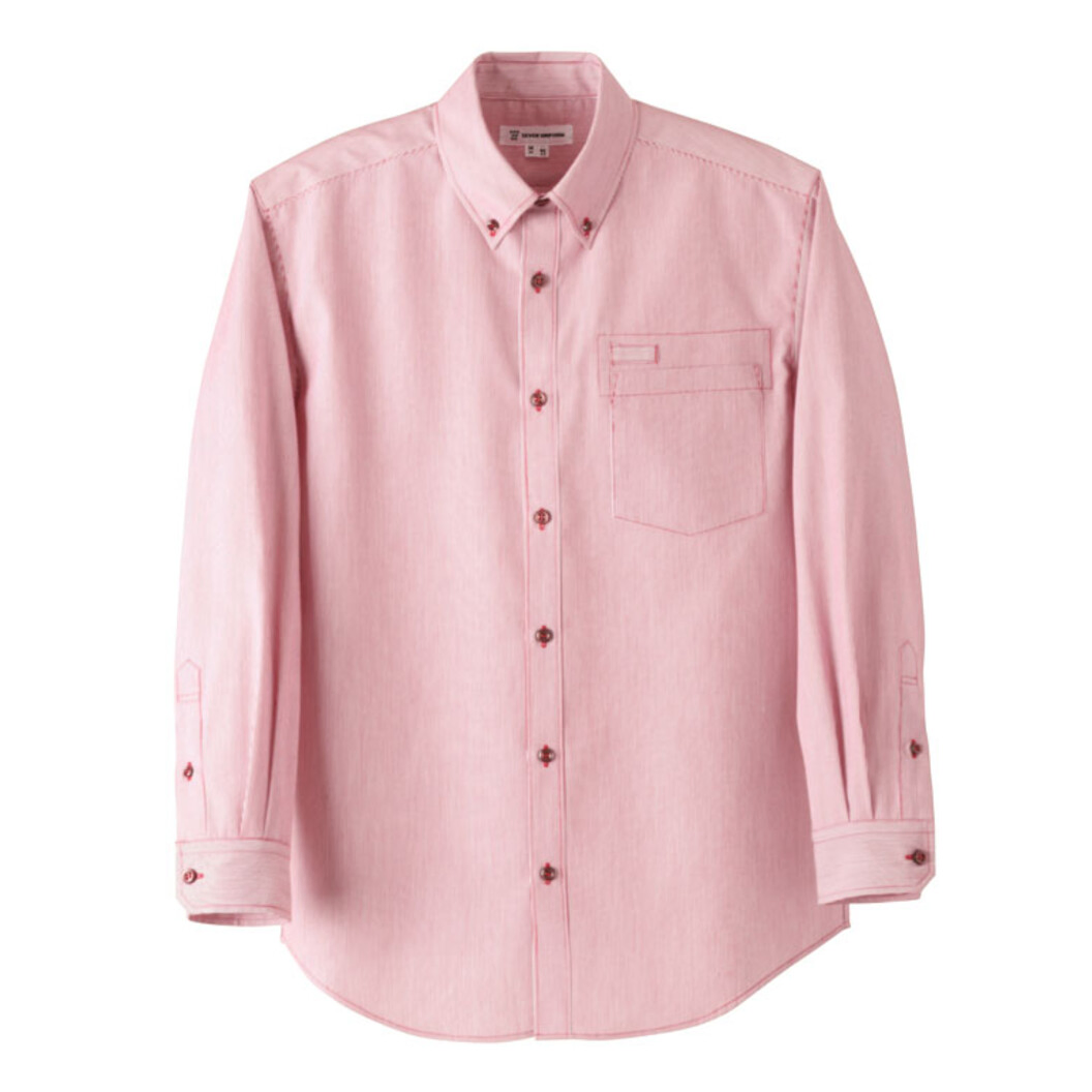 コードレーン生地とは、縦方向に細かい畝が表れた白とカラーの組み合わせによる細かいストライプ柄。細かい柄がゆえに一見すると1色に見えるところがいい。それにより誰もが抵抗なく着用でき、かつ生地の表情があることで価値を感じる生地になっています。ボタンが生地に対して少し濃色なところだったり、ネームチーがあったり、胸ポケット口の補強布が施されていたりとユニフォームシャツとしての必要なディティールがしっかりあるサービスシャツになっています。接客販売からレストランサービス、またはアミューズメントスタッフまでと幅広いデザインシャツとして使われています。BD襟、長袖、男性用。