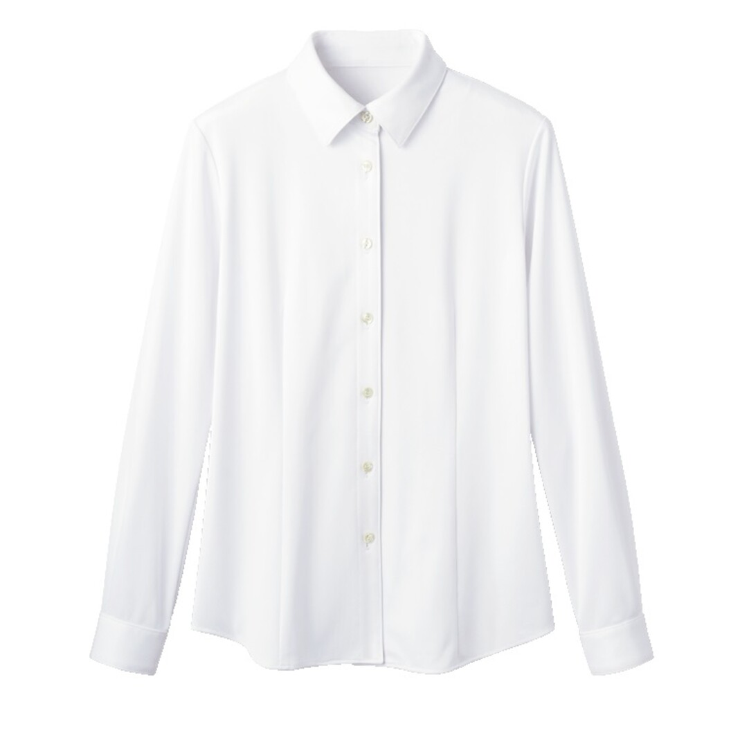 伸縮性のあるニット素材で動きやすくシワになりにくいです。ソフトですべすべと肌触りで一日中快適!しかも透けにくいので安心して着られます。速乾性に優れているのでお家で気軽にお洗濯して部屋干しもOK。ノーアイロンでイージーケア!襟下に、アクセサリー用ボタン付きだから、スカーフやリボンがずれずにいつでもきちんと。