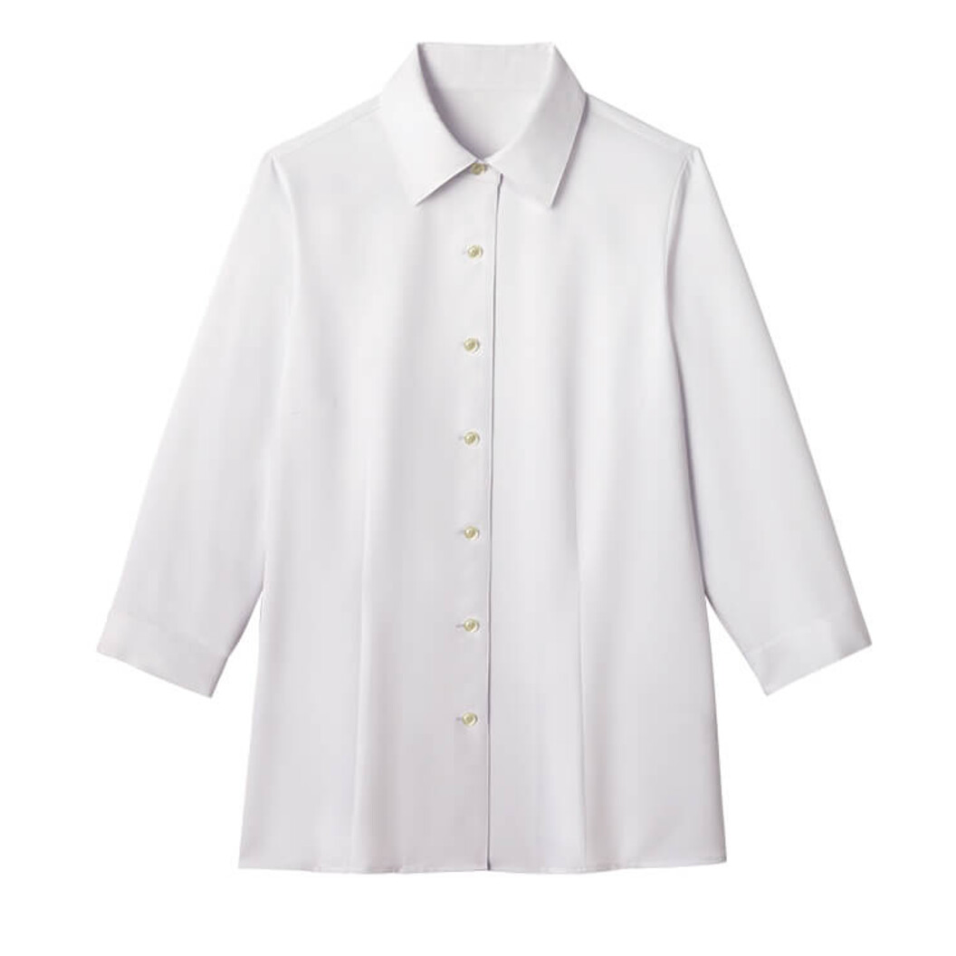 カルゼ織の高級感あるブラウス。ベーシックな台衿つきシャツカラーで、長袖、半袖に加えて七分袖の展開もあります。バスト位置にインナーのチラ見え防止の隠しスナップが付いているので安心です。台衿にはアクセサリー用のボタンが付いているので、スカーフやリボンがずれません。白、ピンク、ラベンダー、ブルーの4色展開です。
