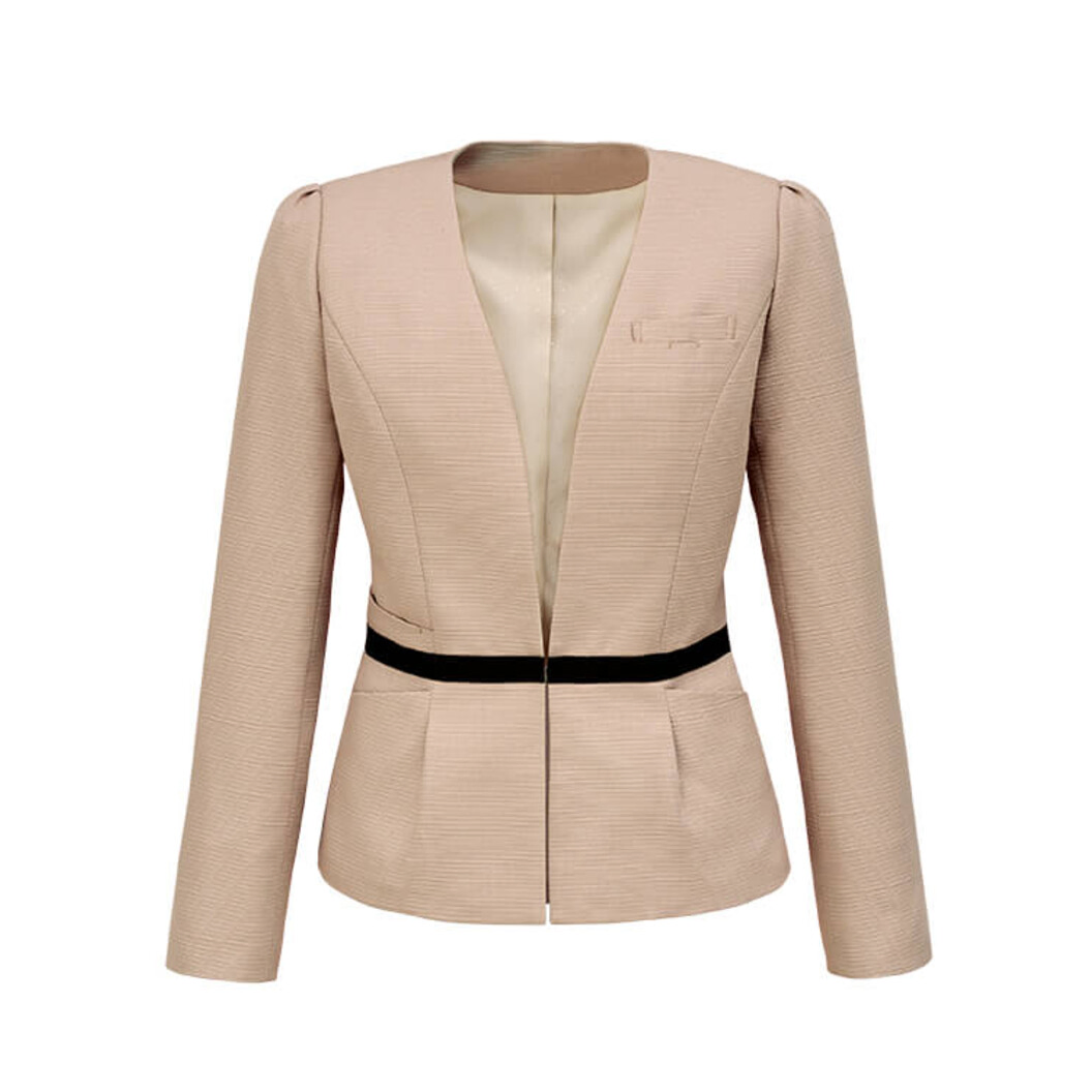 2種類の太さの糸で織り上げた上品なツイード素材。ラメが入っているので華やかな印象です。ノーカラーで前開きをカギホックで留めるタイプなのでスッキリとしたデザイン。ウエストはベルトを締めているようなデザインで引き締め効果があります。袖口にはスリットが入っていて、ワークシーンに合わせて長さの調節ができます。裏地はドット柄で贅沢で女性らしい印象です。左胸にはポケット利用のネームホルダーと内ポケット、右腰にはスマホ用のポケットがあります。ベージュとネイビーの2色展開です。