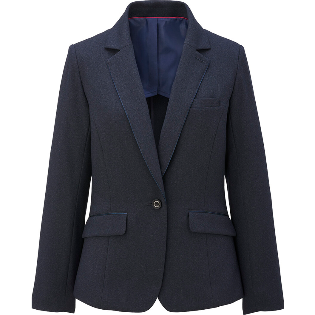 ネイビーのテーラードジャケット。ウールのような風合いとバーズアイ風の杢調柄で上質感があります。ラペル端とポケットにさりげなく同系色のパイピング、裏地には配色のパンピングを施しています。右衿下にはアクセサリー用の釦、左胸ポケットにネームホルダー、内側には胸ポケットが付いています。裏は背抜き仕立て、後ろ裾にはセンターベントが入っています。家庭洗濯ができ、シワも目立ちません。