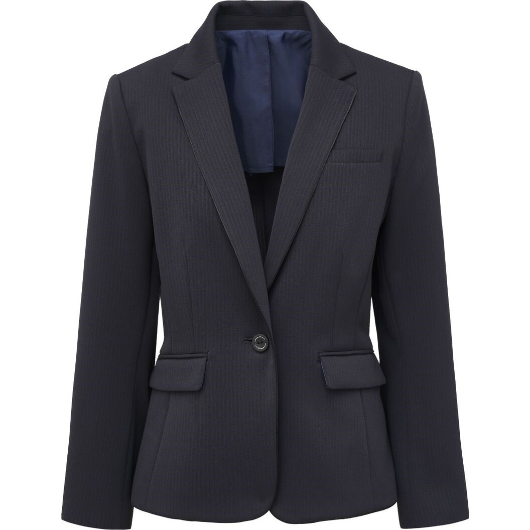 スマートなスタイルの1つボタンのテーラードジャケット。無地調の繊細な陰影がついたストライプ柄。軽量で伸縮性があり、適度なハリ感をもたせたニット素材です。肩や脇腹がすっきり見えるシルエットで、衿端、前端部分に同色サテンのパイピングを配したデザイン。裏地は背抜き仕立て、後ろ裾にはセンターベントが入っており動きやすい仕様です。右衿下にはアクセサリー用のホルダー付き、左胸ポケットにネームホルダー、左胸には内ポケットが付いています。家庭洗濯ができます。