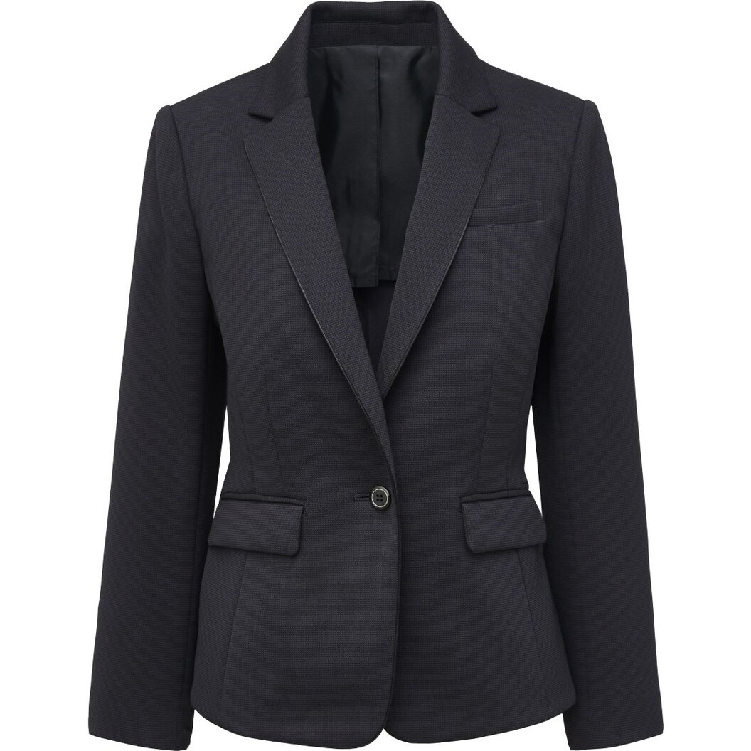 スマートなスタイルの1つボタンのテーラードジャケット。繊細な織りで千鳥柄を表現したエレガントなニット素材。衿端や前端部分に同色サテンのパイピングを配しています。肩や脇腹がすっきり見えるシルエットです。右衿裏にはアクセサリー用のホルダー、左胸ポケットにネームホルダー、左胸には内ポケットが付いています。裏地は背抜き仕立て、後ろ裾にはセンターベントが入っていて、家庭洗濯可能です。