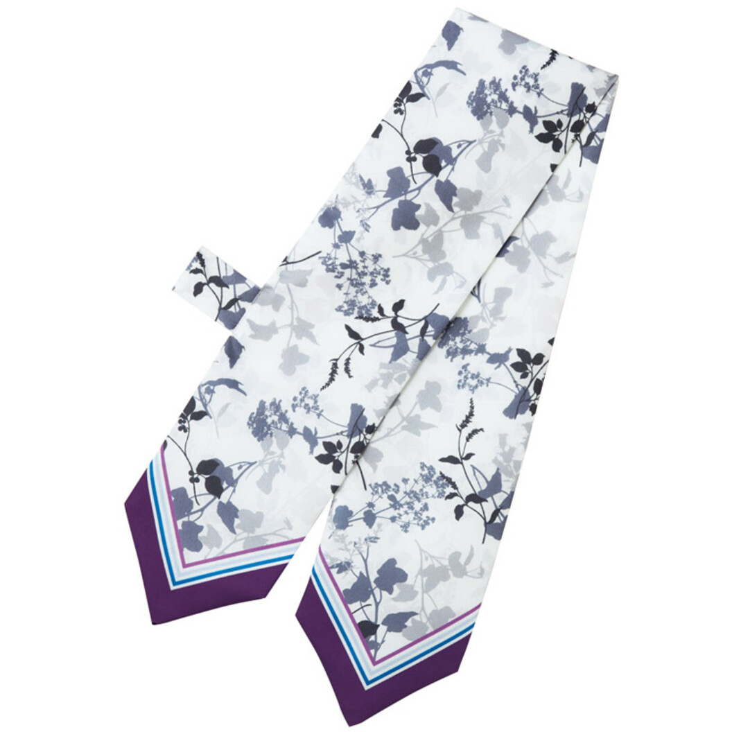 花と緑のスペシャリスト日比谷花壇とのコラボレーションで生まれたボタニカルプリントシリーズ。花に宿る、「癒しの力」をデザインに展開、「ボタニカル・エアー」はカンパニュラとアルケミラ・モリスをモチーフにした柄。植物の生命力を感じるボタニカルデザイン。コーディネートしやすいパープル系のカラーです。共布のループ付きなのでスカーフを結んだように簡単にアレンジできます。