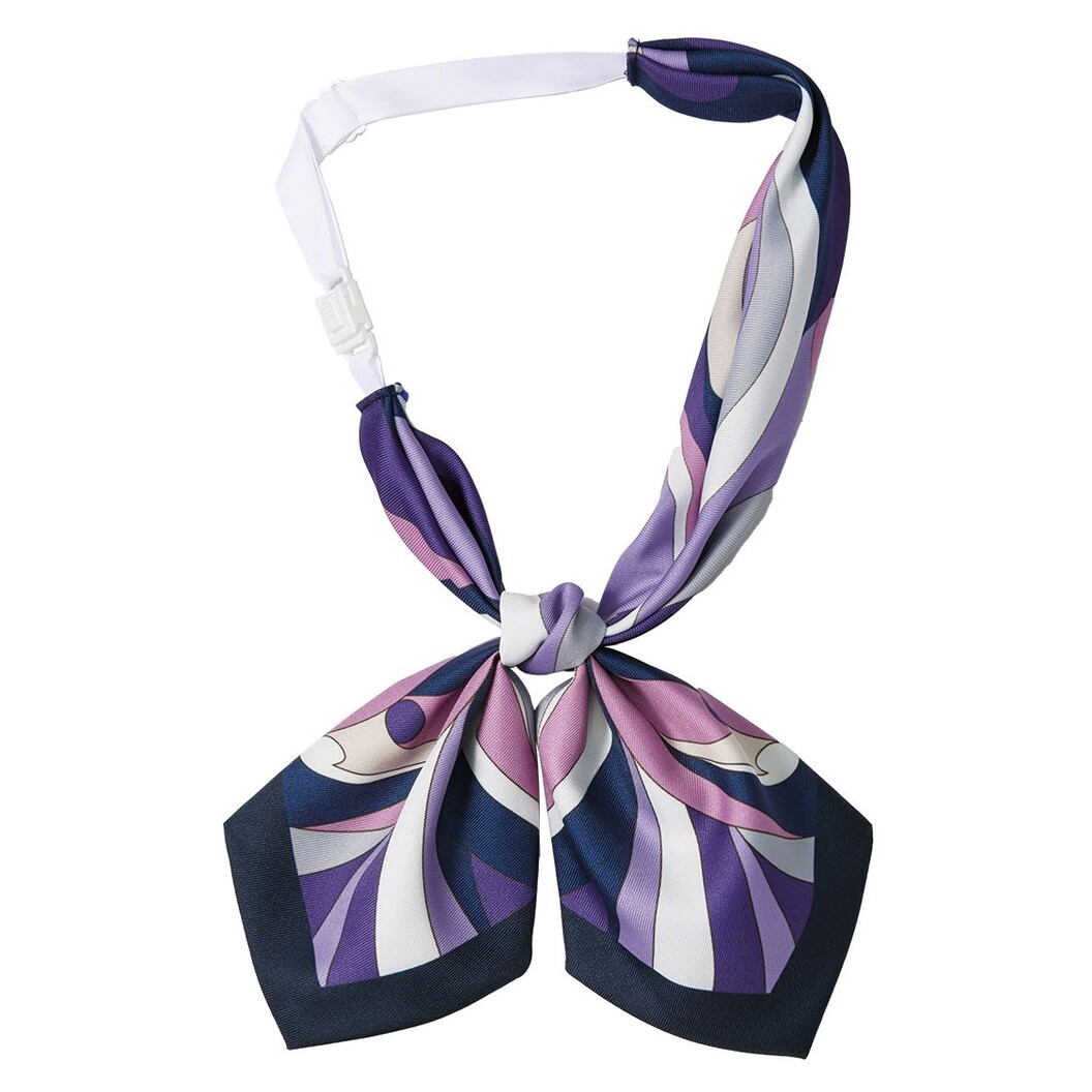 ラベンダー系、ブルー系の2色展開のリボンタイで、衿元を華やかに演出します。中央、右サイドに付けることにできる2WAY仕様となっています。