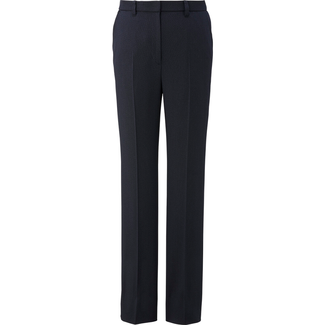 ネイビーのストレートパンツ。ウールのような風合いとバーズアイ風の杢調柄で上質感があります。後ウエストはゴム入りになっていて立ち座りが楽な仕様です。両脇、後ろ左右にポケット付き、家庭洗濯ができ、シワも目立ちません。