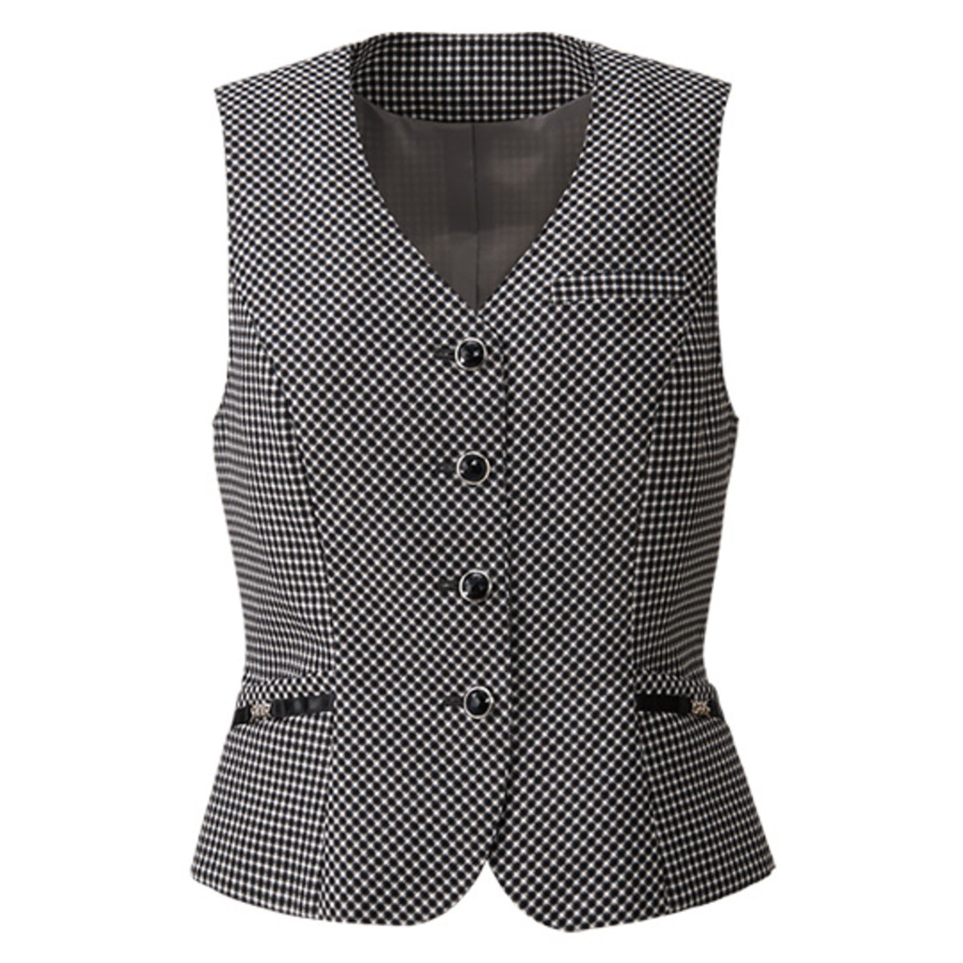 人気の黒白チェックにグレーで柔らかさを加え、より親しみやすい印象にアレンジ。後ろベルトはシルバーのバックルでチャーミングな後姿を演出。