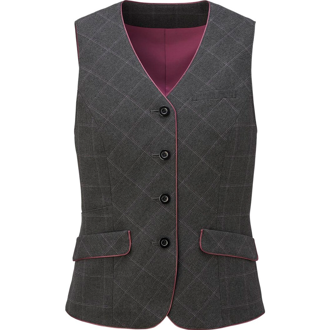 ウインドーペン柄のベスト。前端とポケット端にカラーパイピング(グレーにピンク、紺にブルー)を配したデザインで、ベーシックながら華やかな印象。左胸ポケットにネームホルダー、右腰にはダブルポケットとスマホ用ポケット付き。後ろウエストはベルトでサイズ調節ができ、裾にはセンターベントが入っています。グレー系と紺系の2色展開です。家庭洗濯ができ、シワも目立ちません。