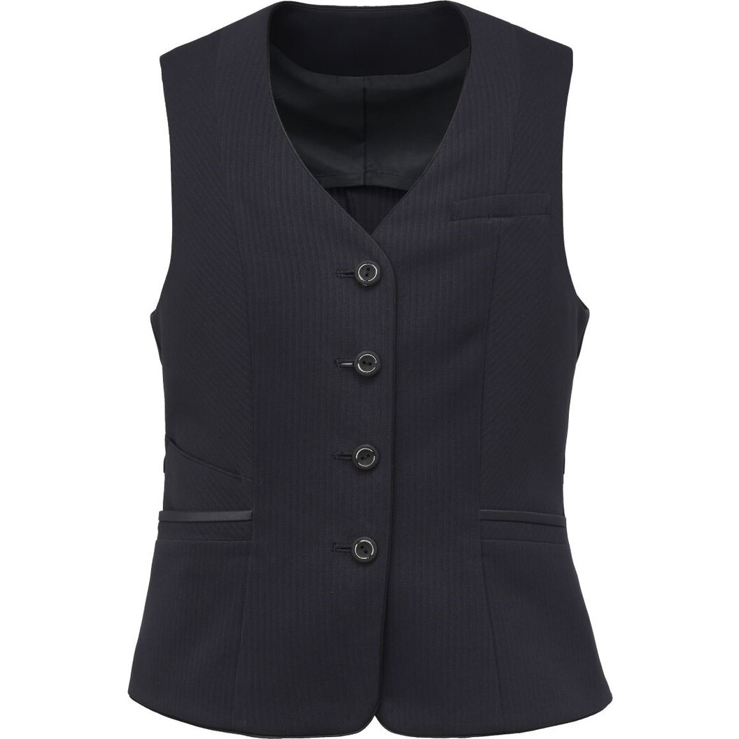 4つボタンのベーシックなベスト。無地調の繊細な陰影がついたストライプ柄。軽量で伸縮性があり、適度なハリ感をもたせたニット素材です。胸元を美しくかつ縦長に見せるプリンセスラインの切り替え。脇の地の目をバイアス使いにし、スタイルよく見せます。サテンベルトでウエストマークし、後ろはペプラムにすることで腰高に見せる工夫をしています。裾は少し長めにしてヒップを小さく見せる工夫をしています。右衿ぐり見返しにはアクセサリー用のホルダー付き、左胸ポケットにネームホルダーが付いていて、右腰にスマホの入るチェンジポケット付きです。裏地は背抜き仕立てで、家庭洗濯が可能です。