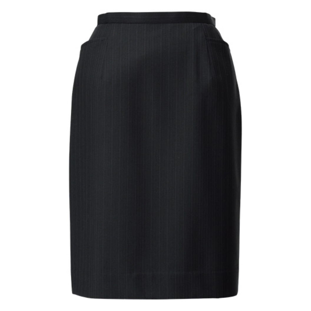 黒をベースにしたヘリンボーン組織によるシャドーのストライプに、ダークワインのラインを加えたおしゃれ感あるストライプ柄。裾にゆとりを持たせ歩きやすく、かつスマートに見える立体的なタイトスカート