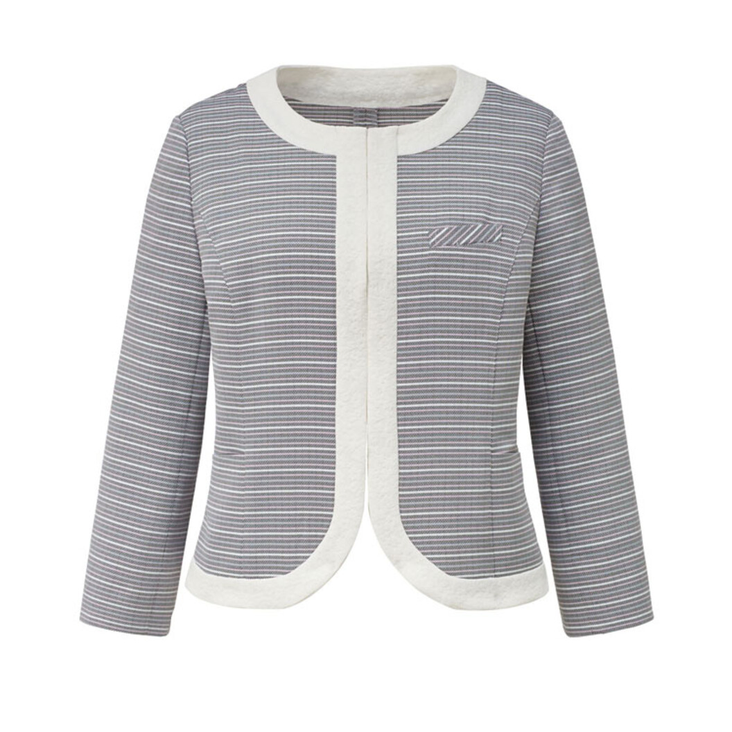 華やかで軽快なボレロ風ジャケット。ラメ糸の入ったキャンディカラーで配色したボーダー柄の素材を使っています。ピンク系はグレーベース、イエロー系はネイビーベースになっています。脇下に消臭・制菌加工のデオファクターテープを施しているので快適に過ごせます。また、袖口にはスリットが入っていて袖丈の調節ができます。