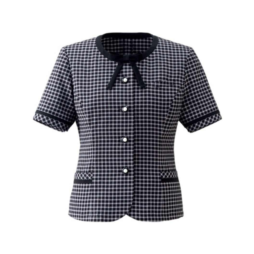 繊細で優しいモノトーンのグレンチェックで、白のバランスが多く、ピンクの差し色効果で明るい印象。また、袖やポケットの縁取りがリボン風のデザインになっていたりと、こだわりの細部にも注目です。