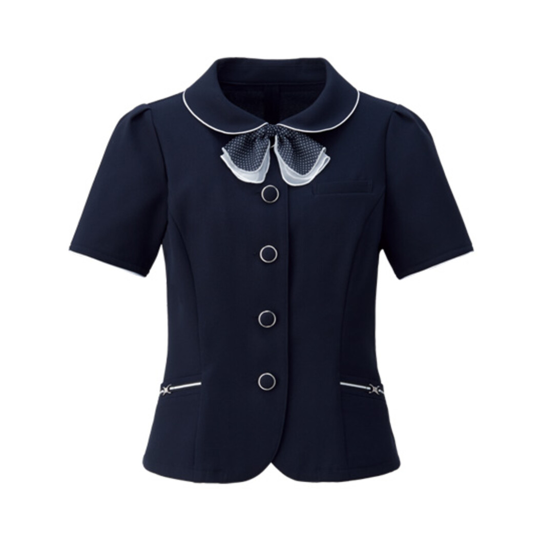 衿ぐり、袖口、後ろウエストに清潔感のある白いパイピングの入ったオーバーブラウス。やや明るめのネイビーが夏らしさを軽快感を表現。