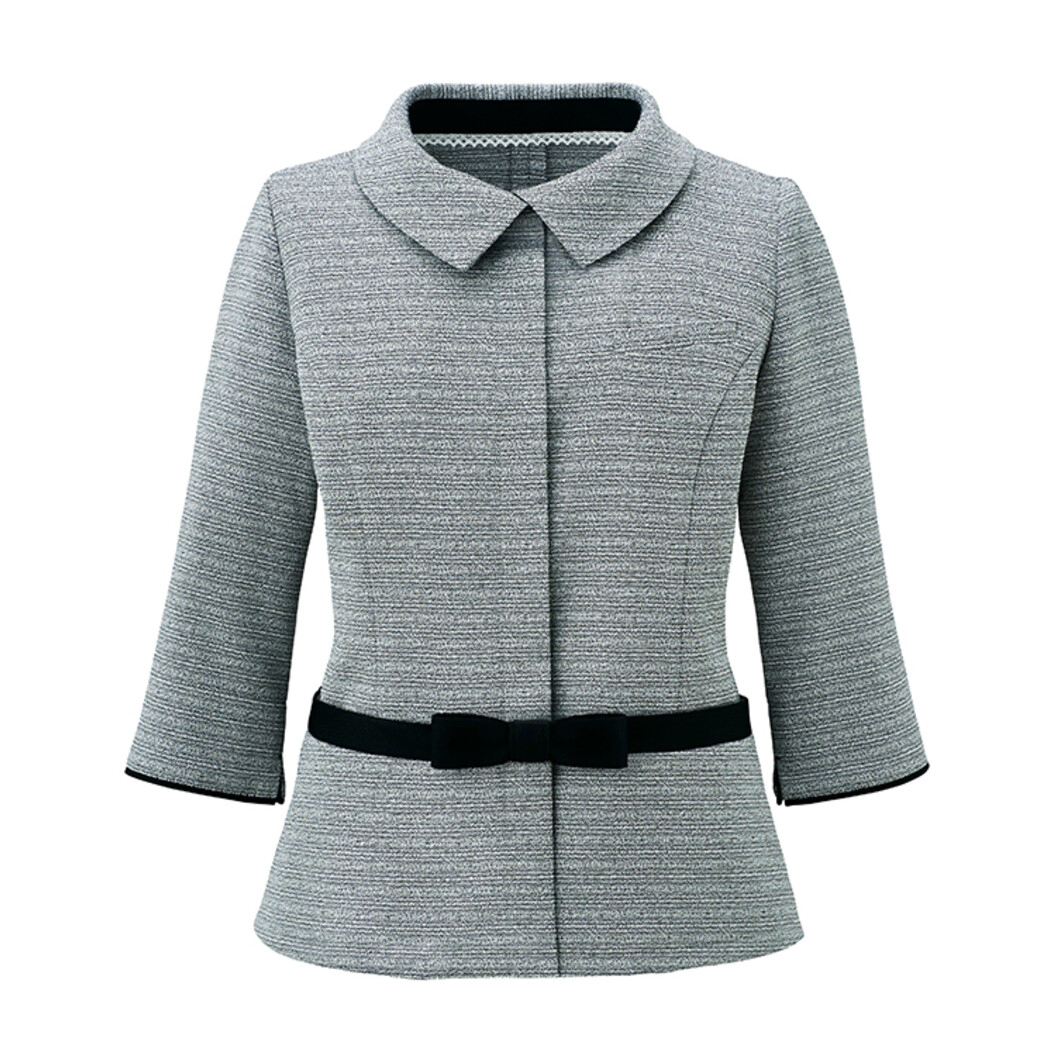 上品で可愛いウエストリボン付きのオーバーブラウス。シルバーラメ入りボーダー柄のサマーツイードで、リボンと袖口は光沢感のある濃色生地を使っています。袖は七分丈で折り返して着用すると丈調節でき、アクセントにもなります。前中心はスッキリとした比翼仕立て、左胸にはペン差しポケット(ネームホルダー付き)、両腰にはスマートフォンの入る実用的なポケットが付いています。左腰ポケットには小分け用インナーポケットも付いています。脇下裏側には消臭テープ、後衿ぐりにはレースの消臭テープが付いています。色はグレー系と紺系の2色展開、配色生地はそれぞれ黒、紺で、家庭洗濯可能です。
