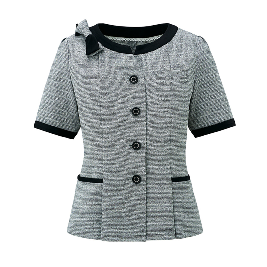 シルバーラメ入りのサマーツイードのオーバーブラウス。衿ぐり、袖口、ポケット口、リボンに濃色生地を配し、全体を引き締めています。リボンはブローチピンで取り外し可能。前後の裾にはプリーツが入っているので、お腹・ヒップ周りをカバーします。左胸にはペン差しポケット(ネームホルダー付き)、両腰にはスマートフォンの入る実用的なポケットが付いています。左腰ポケットには小分け用インナーポケットも付いています。脇下裏側には消臭テープ、後衿ぐりにはレースの消臭テープが付いています。色はグレー系・紺系・ラベンダー系・ブルー系の4色展開、配色生地は紺・ブルー系には紺、グレー・ラベンダー系には黒となっており、すべて家庭洗濯可能です。