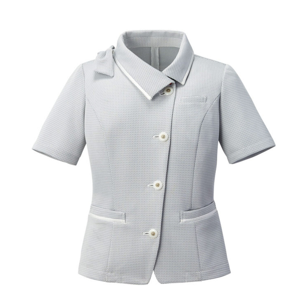 女性らしいカラーを織り交ぜたリズム感のある柄のオーバーブラウス。右肩のリボンは取り外し可能、胸ポケットにはネームホルダーが付いています。両腰のポケットはスマートフォンが入る大きさ、左腰ポケットは小分けポケット付きです。色は3色展開で、白地にはサックス、ネイビーにはラベンダー、黒には白&グレーを配しています。ニット素材なので着心地良く、高い吸汗・速乾性で一日中快適に過ごすことができます。
