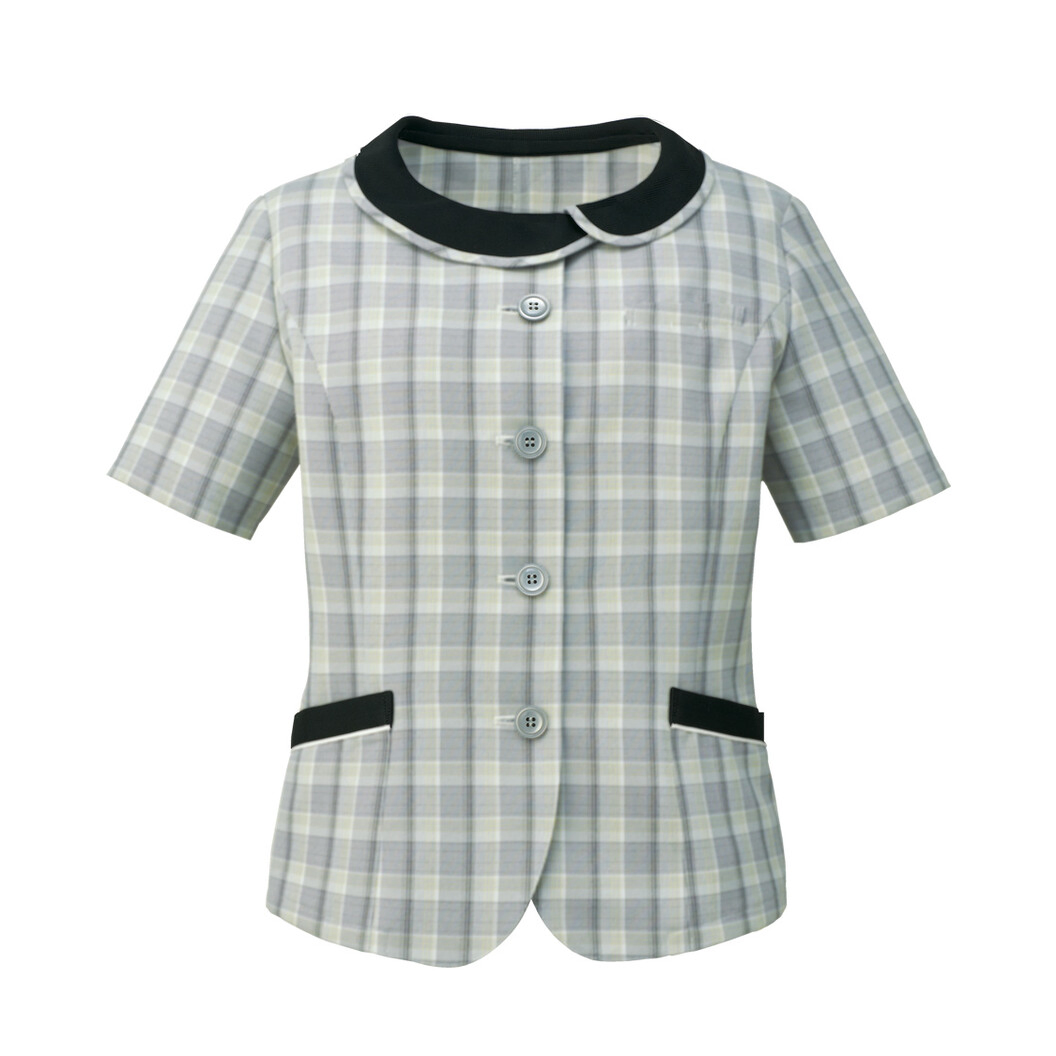 上品なチェック柄のオーバーブラウス。繊細なラインと色使いが上品な印象です。女性らしい重ね襟のデザインと襟とポケット口の黒配色がアクセントになっています。自然を感じさせるライムグリーン系、引き締め効果のあるネイビー系、優しげで上品なラベンダー系の3色展開。ネイビー系は襟端とポケットに白の配色を入れています。ライムグリーン系、ラベンダー系はポケットに白の配色、襟端は身頃と同じ素材でトリミングしています。脇下には臭いを抑えるデオファクター(R)の消臭テープを付けているので、汗をかいた時も安心です。胸ポケットにはネームホルダー、両腰ポケットはスマホが入る大きさ、右腰はダブルポケットになっています。家庭洗濯ができ、シワも目立ちません。