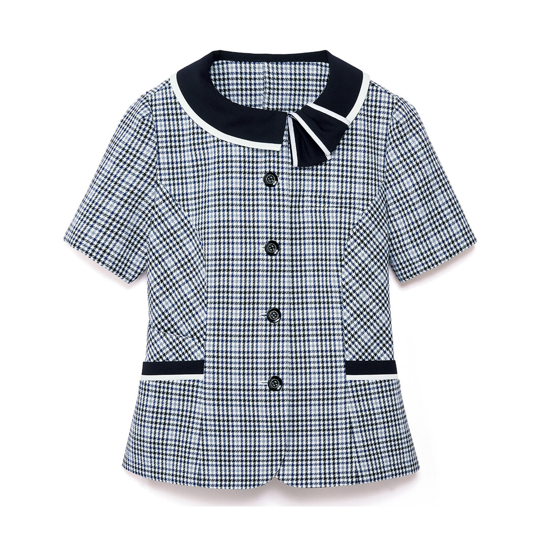 繊細な印象のかすれ調チェック柄のオーバーブラウス。首元には華やかなアシンメトリーリボンを付けました。楽に着替えられるようにリボンは一体型となっています。肩幅はコンパクトに見えてなおかつゆとりを持たせたタック袖山、背面は腰高に見せるウエスト切替ライン。襟やポケットは汚れの目立ちにくい配色です。左胸、両腰(右腰2つ)にポケットが付いています。ポケットの内布には抗ウイルス素材「クレンゼ」、アームホールにはデオファクターの消臭テープを使用しています。