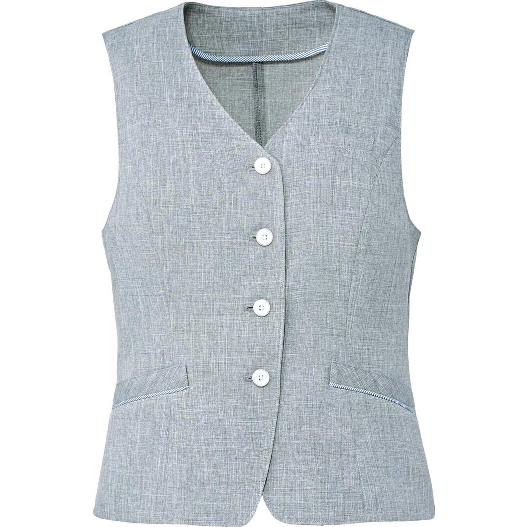 天然素材風に仕上げた生地のベスト。ベーシックできちんとした印象。ポケットにはパイピングで、前裏地、後ろベルト裏にストライプの生地を配したデザイン。後ろウエストはベルトでサイズ調節ができ、裾にはセンターベントが入っており動きやすい仕様。左胸ポケットにネームホルダー、右腰ダブルポケット。ライトグレー杢とネイビー杢の2色展開です。家庭洗濯ができ、シワも目立ちません。