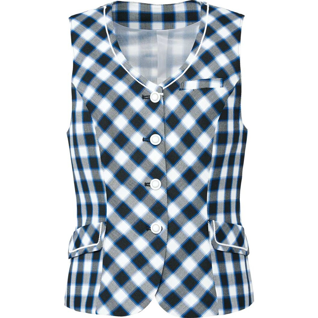 リサイクルポリエステル繊維「エコルナ(TM)」と樹の繊維「ソアロン(R)」を使用したベスト。見た目に爽やかなマリン風チェック柄で、メッシュ素材ながらも透けにくいのも良さです。襟ぐり、ポケットには白のパイピングを入れ清涼感をアップしたデザイン。シルバーを組み合わせた釦も涼し気な印象に仕上げています。胸ポケットにはネームホルダー、右腰ポケットは内側に小さなポケットが付いています。バックベルトが付いておりサイズ調節可能です。家庭で洗濯ができ、シワも目立ちません。
