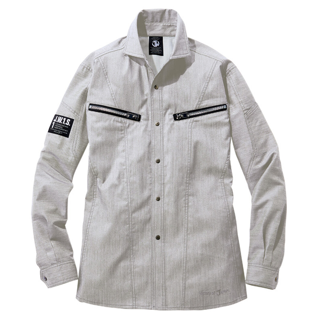 シルバーのビッグファスナーと衿高デザインが魅力 デニム調のストレッチ素材を使用し、ライダースジャケットテイストのデザインに仕上げたJawinの新シリーズです。