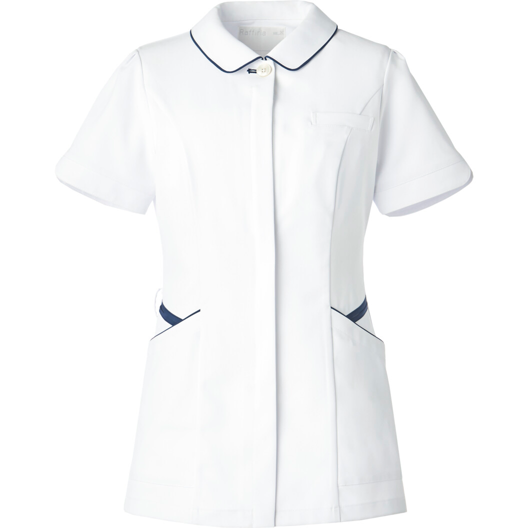 爽やかな明るいネイビーの差し色が印象的なジャケットです。立体的で可愛らしい花型のボタンも特徴です。腕の動きをスムーズにする袖口スリット、配色使いでウエストラインの引き締め効果にもなっている腰の二重ポケットで機能的にも便利なナースウェアです。素材のストレッチバルキーラチネは伸縮性に優れ、伸びやかで美しいシルエットをつくります。汗をかいてもさらりとしていて透けにくいのがポイントです。