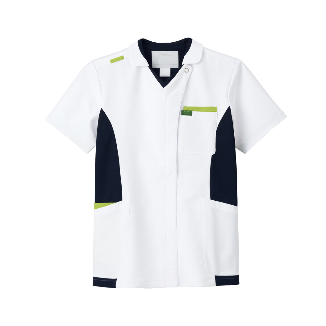 高機能素材ストレッチライトフィックスを使用した男女兼用ジップスクラブです。ストレッチライトフィックスは軽量で伸縮性があり、吸水速乾、制電機能も備えた素材です。襟付き仕様のため、首掛けストラップを使用する方にもおすすめです。また、羽織って着るジップタイプなので、着脱時に髪型が乱れたり、メイクが崩れる心配もなく安心できます。同素材のパンツ(5035SC)と合わせて着用することで、より快適に過ごしていただけます。