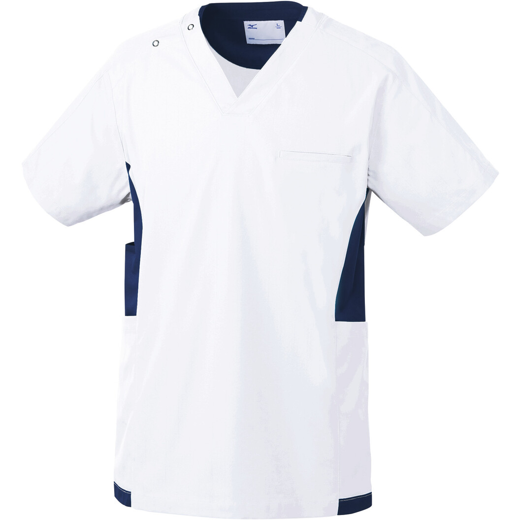 脇や後ろの襟元にネイビーの切り替えを配した、スポーティな印象のツートーンウェア。 ソフトな肌ざわりでありながら、タフに着こなせる「ストレッチツイル」。 ストレッチ性能と工業洗濯対応の高い耐久性を併せ持ち、制電糸入りでホコリを寄せにくく、SEK(赤)認証の制菌加工も施した、医療・福祉の現場に適した生地です。