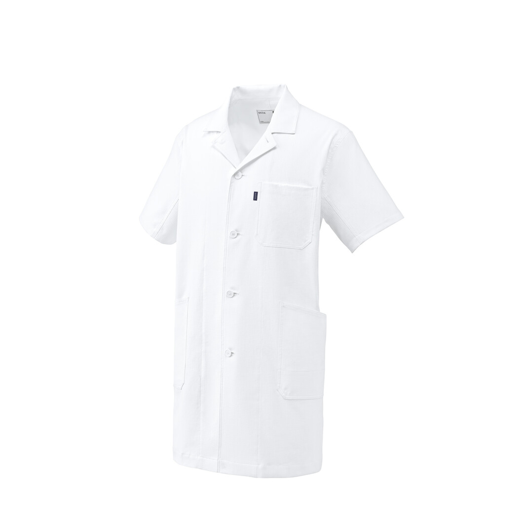 カジュアルなシルエットのドクターコート。 軽い着心地で快適に過ごせます。 格子状の織り柄が特徴的な「リップ ストップ 」。 シャリ感があり、軽い素材ながらも裂けにくく丈夫 。 動きに合わせて伸びるストレッチ性能、抗菌防臭性能も備えています。